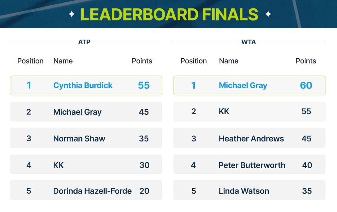 So, congratulations to the top three finishers on both the ATP and WTA leaderboards. The No. 1 scorers will each take home a $25 gift card.