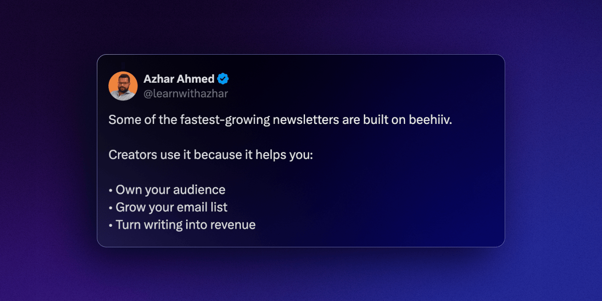 A newsletter is different. Your list is yours. Every subscriber is earned and stays earned. And on beehiiv, the tools to grow it, monetize it, and own it completely are built in from day one.